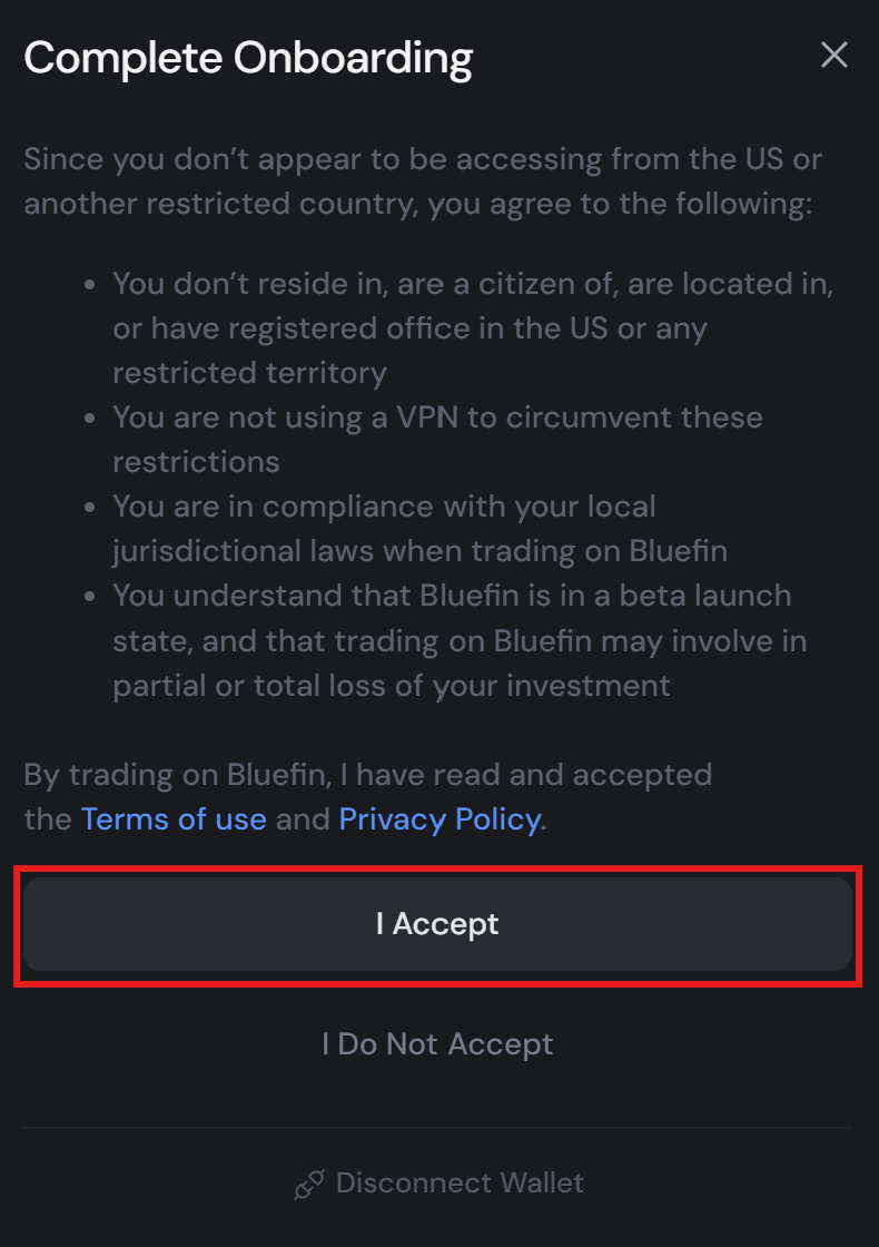 Afterwards you will have to accept the terms of use for trading on the platform, and if the onboarding is succesful you will see a pop-up show in the bottom right corner of the app that says "Terms accepted! Welcome to Bluefin!"