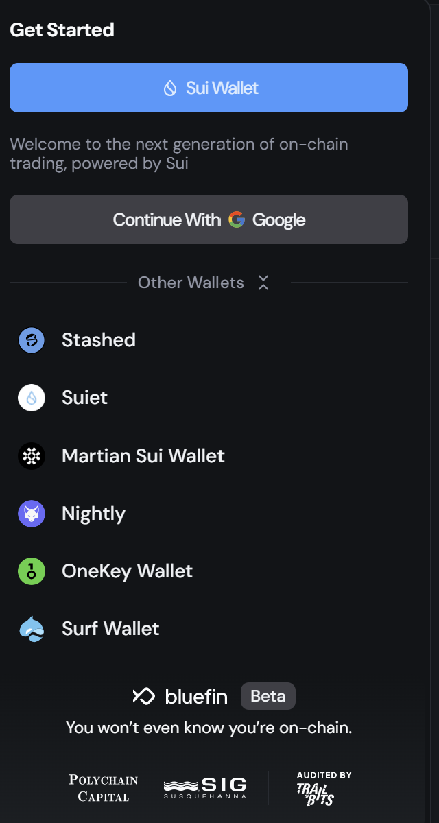 Bluefin supports a variety of web3 wallets powered by the Sui blockchain, including Suiet, Martian, Stashed, Nightly and Surf Wallet. The most popular options are Sui Wallet and connecting via a Google account (enabled by ZK technology). Using Google accounts allows users to avoid needing to manage Private Keys, and the public key generated for your account will be unique for Bluefin, meaning that you can connect to Bluefin on any device using your same Google account and the public address in the Bluefin application will be the same.