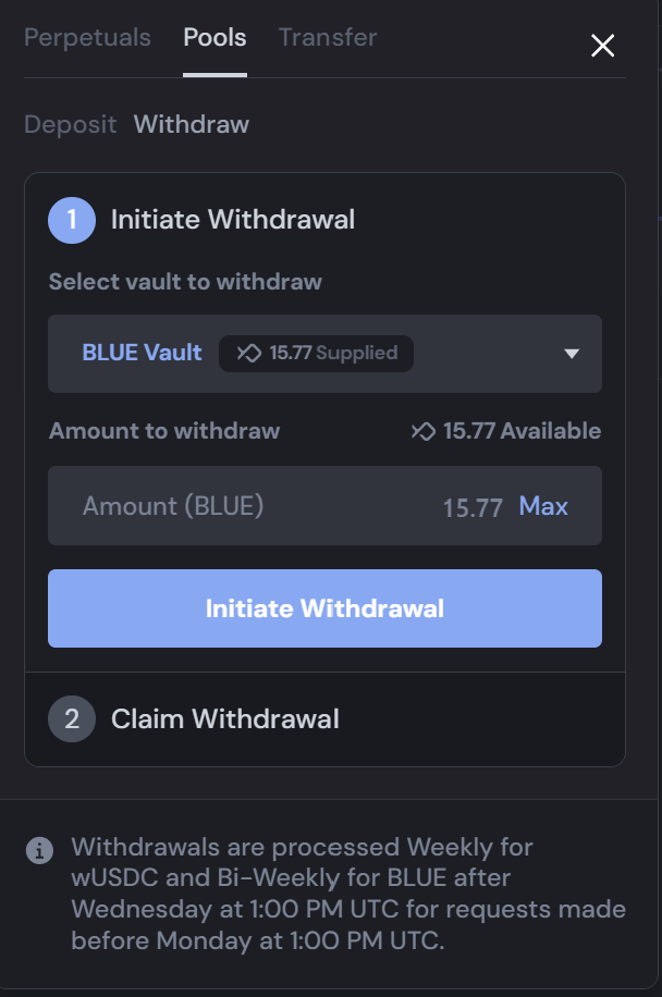 Note that your withdrawal request won't be processed instantly and you will need to return to the modal to claim it once it becomes available. All withdrawals from the BLUE Vault are processed **every two Wednesdays** for requests made before Monday at 1:00 pm UTC.&#x20;