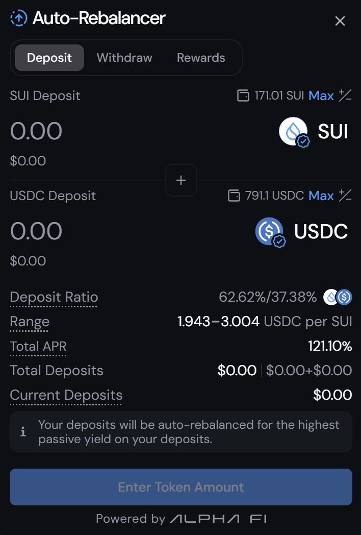 Once inside the Rebalancer modal the process for opening a position is very similar to the one explained in the tutorial for [adding liquidity](https://learn.bluefin.io/bluefin/bluefin-spot-clmm/tutorials/adding-liquidity-creating-a-position), just select the amounts of each token you want to deposit and click on **Add Liquidity** at the bottom of the modal. Note that the token amounts will depend on the Deposit Ratio, which in term depends on the selected Range and the current price of the Pool. However, the Auto-Rebalancer sets this range automatically and will dynamically adjust your deposits as soon as your positions moves out of range, for the highest passive yield.