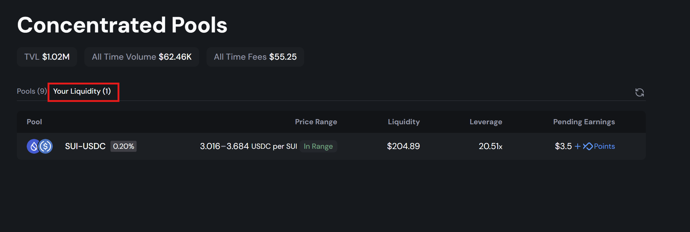 You'll be able to view all of your open positions in the "Your Liquidity" window of the Concentrated Pools Page. Remember that only the positions that are **In Range** will be accruing fees and rewards, if your position is **Out of Range** then you'll have to close it and open a new one if you want to continue earning incentives.&#x20;