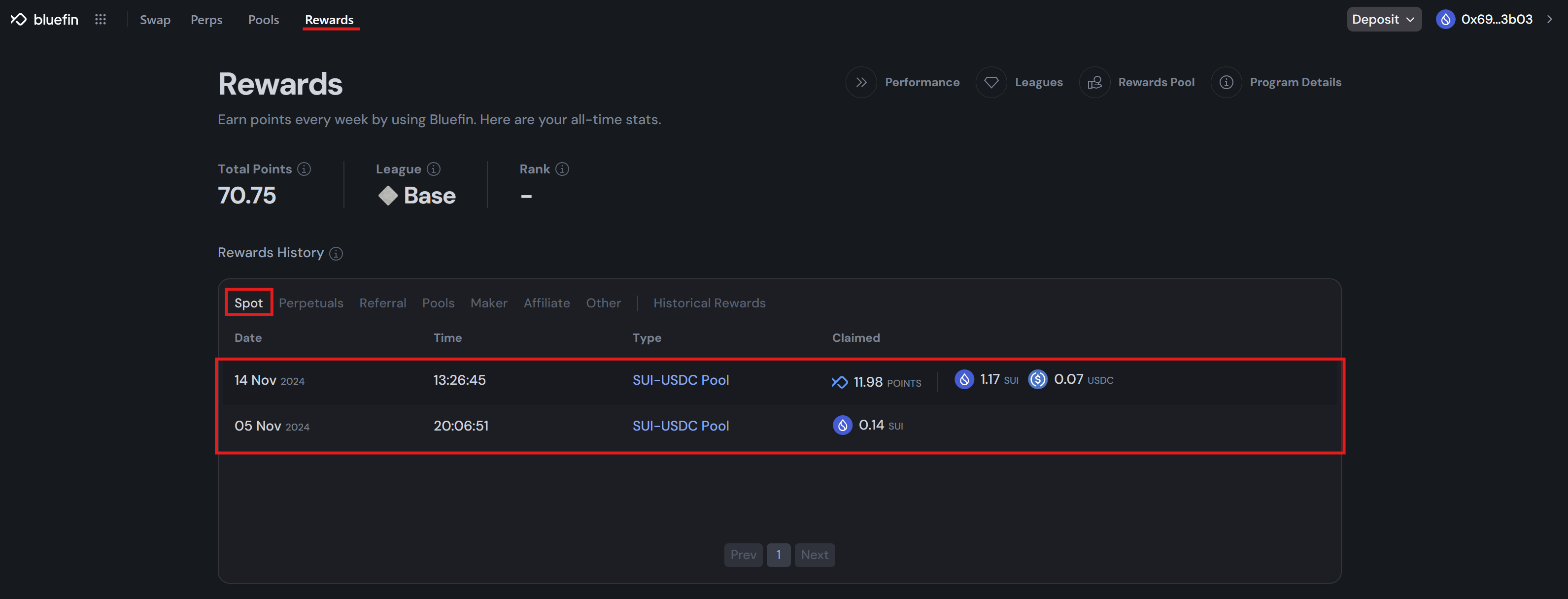 Finally, the rewards you've claimed will be viewable in the [Rewards Page](https://trade.bluefin.io/portfolio/rewards-dashboard) by selecting the "Spot " tab below "Rewards History". Both SUI and BLUE rewards are directly sent to your wallet upon claiming.&#x20;